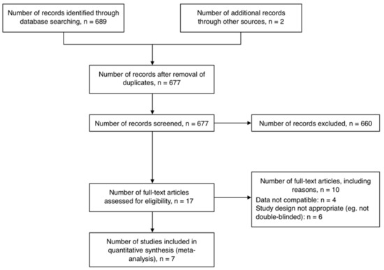 Six hundred and seventy-seven nonduplicate studies were obtained from electronic searches, out of which 17 eligible studies were identified (Figure 2). A total of 10 studies were excluded due to incompatible data (n = 4 [14,21,22,41]) and inappropriate study design (n = 6 [25,42,44,56,57,58]). Seven studies comprising nine RCTs and a total of 462 participants were included in this review [15,16,17,18,19,43,59]. All studies were of parallel design except one [18], and placebo-controlled by administration of placebo matching the intervention (Table 1). Three RCTs included participants with hypertension [16,19,59], two of which included subjects with mild hypertension [19,60], four RCTs included diabetic participants [15,18,43], of which one included type 1 diabetic subjects [15], one RCT included untreated hyperlipidemic patients [17], while only one RCT included healthy subjects [15]. The SG Stevioside was used as intervention for all studies at a daily dose varying from 200–1500 mg. Variations were observed in number of times the supplements (both intervention and placebo) were administered per day. The duration of Stevioside or placebo administration ranged from 4 h to 2 years.