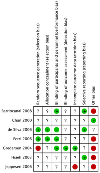 The contents of placebos varied between studies and were specified in only three studies, including maize starch [18,43] and talcum [17]. For the rest of the included studies, “matching placebo” was the only annotation regarding contents of placebos. Additionally, lifestyle adjustments also varied across the studies, and the majority of included studies did not specify their sources of funding. Discrepancies between studies were observed by assessing the risk of bias (Figure 3). Two studies adequately reported randomization and allocation concealment procedures, and four studies adequately reported blinding of participants and personnel, while only one study adequately reported blinding of outcome assessors. Other biases, such as continuation of medicine, were detected in several of the studies. However, the majority of included studies lacked information regarding the assessed biases.