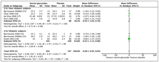 When including findings from clinical trials investigating BMI and body weight as second outcomes, similar results are reported indicating no change in these measures post treatment of Stevia compared with placebo treatment [16,17,19,22].