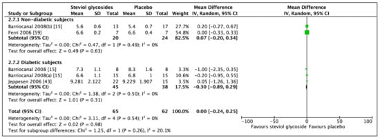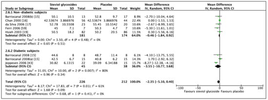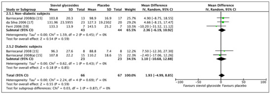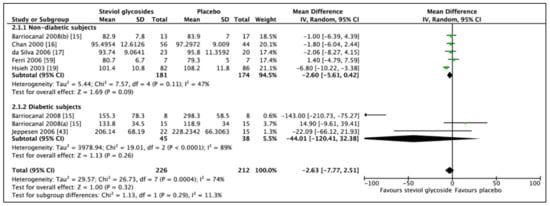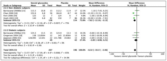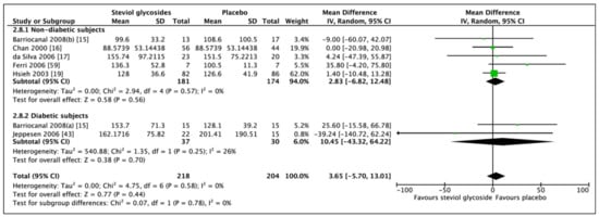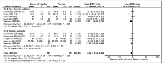 For a proper investigation of the effect of Stevioside on diabetic biomarkers, subgroups were produced, in which studies including diabetic subjects and studies including nondiabetic subjects were analyzed independently of each other. If data was adequate, further categorial subgroup and sensitivity analyses were performed.