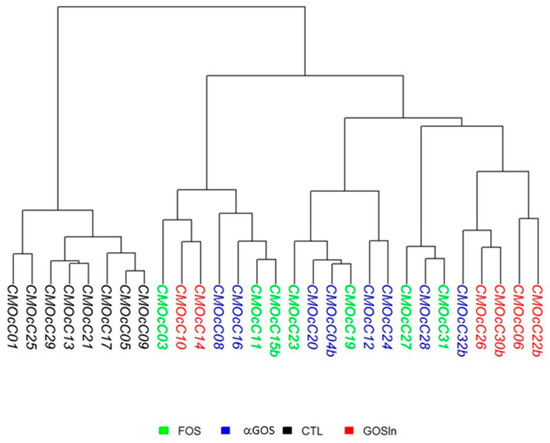 Following 16S rDNA sequencing, no significant differences were noticed in raw sequence numbers between cecocolonic samples collected at PND14/15 (355,245 ± 10,367, 30,306 ± 13,817, 40,275 ± 18,343 and 31,808 ± 10,101 for CTL, FOS, GOS/In and αGOS, respectively) or in percentages of sequences kept after quality filtering (83.8 ± 4.0, 76.4 ± 18.4, 83.9 ± 4.2, and 81.7 ± 7.1). The cecocolonic contents of animals supplemented with OS exhibited similar reductions in richness (p < 0.001) compared with CTL animals (Chao1 values: 66.2 ± 21.0, 72.9 ± 28.1, and 73.9 ± 35.3 for FOS, GOS/In and αGOS, respectively versus 180.0 ± 35.7 for CTL). The cluster dendrogram generated using weighed UniFrac metric which illustrates beta or between-sample diversity, highlighted an obvious dissimilarity between the microbiotas of the OS-supplemented animals and those of animals from the CTL group (Figure 1) but did not reveal any effect of the nature of the OS.