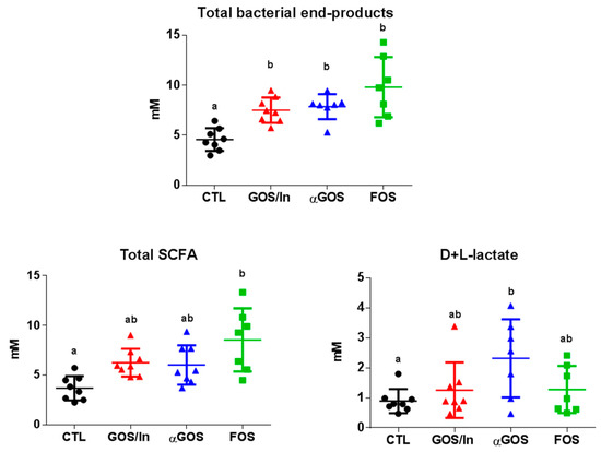 In the cecum, the concentration of total end products increased in all OS groups compared to CTL (Figure 2). This was mainly due to an increase in SCFA concentration, which only reached statistical significance in the case of FOS and also an increase in lactate concentration in the case of αGOS.