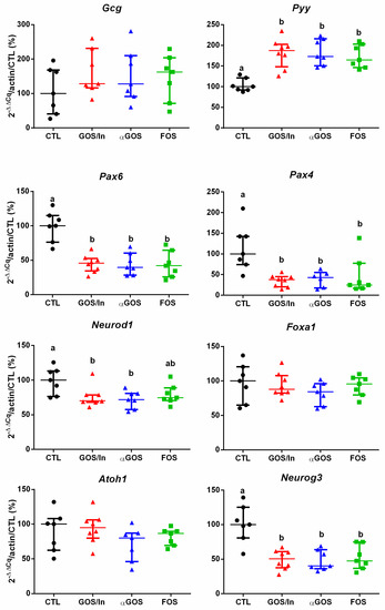 In the proximal colon, the impact of OS supplementation was much more moderate and their only significant effect was a decrease in the expression of Pax4 (Figure S3).