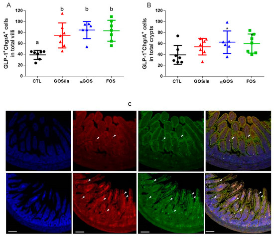 Effect of oligosaccharides (OS) supplementation on the density of GLP-1 cells in ileum: (A) in villi (B) in crypts. Different letters indicate significant differences among groups (p < 0.05); Individual, mean and SD values are plotted (n = 6 to 7 per group). (C) Representative images of immunofluorescence in ileal sections from a control solution (CTL) (top) and αGOS groups (down), arrows indicate positive fluorescence in cells: blue (DAPI, nuclei staining), red (GLP-1 cells), green (ChrgA cells) and merge (GLP-1/ChrgrA cells). Bars indicate 100 µm.