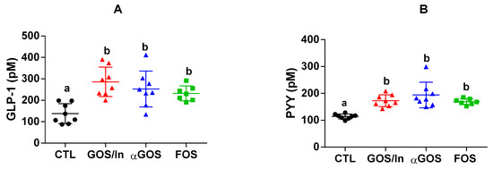 Thus, our study confirms the prebiotic character of αGOS and, in addition, extends the well-known activity of FOS and GOS/In as secretagogues of satiety enteropeptides to this new prebiotic, a finding which is in accordance with the satietogenic effect described in humans [67].