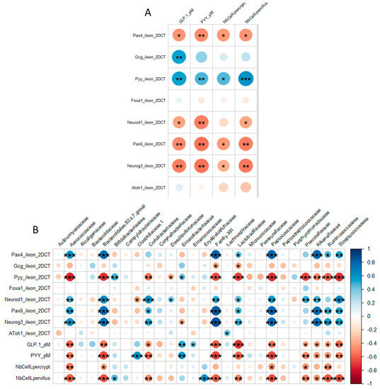 Correlograms within EEC descriptors (A) or between these descriptors and the relative abundances of main bacterial families (B). Positive correlations are displayed in blue and negative correlations in red. The intensity of the color and the size of the circles are proportional to the correlation coefficients. Asterisks indicate the level of significance (*, p < 0.05; **, p < 0.01; ***, p < 0.001). On the right of the correlogram, the color legend shows the correspondence between correlation coefficients and colors.