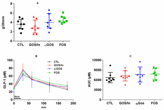 Similarly, at PND 124/126, plasma concentrations of GLP-1 (CTL: 34.4 ± 13.5; GOS/In: 38.6 ± 28.6; αGOS: 28.9 ± 10.0 and FOS: 37.9 ± 20.6 pM) and PYY (CTL: 84.7 ± 4.0; GOS/In: 88.7 ± 7.8; αGOS: 91.4 ± 7.3 and FOS: 91.5 ± 5.8 pM) measured 2h after an oral bolus of glucose did not show any significant difference between groups.