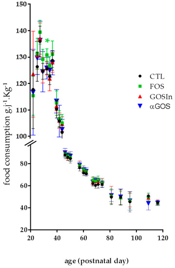 Daily consumption of food in the post-weaning stage, expressed as kilograms of bodyweight. The asterisk indicates a significant difference between FOS and CTL groups (p < 0.05). Data are means ± SD (n = 7 to 8 by group and day).