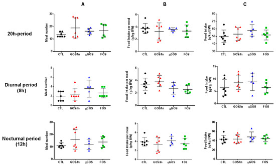 This experimental set-up was designed to form 8 supplemented males, originating from 4 different litters, per group at each studied age. Due to the death of one of the pups during the supplementation period (this pup was then replaced by an untreated one to equilibrate the litter size), the number of pups in the FOS group at PND14/15 was reduced to 7. These values are maximum numbers that are not always found in each of the analyses (see the illustration legends). This stemed from either physiological reasons (e.g., 2 animals did not eat at all during the fasting-refeeding test), or because of quality requirements (e.g., reliable data from in physiological cages could only be obtained for n = 7 in CTL and GOS/In groups; n = 6 in FOS group and n = 5 in αGOS group), or statistical inconsistency (e.g., outliers identified by the Dixon’s Q test were excluded in RT-qPCR analysis as well as food/beverage consumption follow-ups), or technical problems (e.g., accidental spillage of supernatant before analysis of bacterial end-products or sequencing failure during 16S rDNA analysis or poor quality of some tissue sections in the case of immunochemical analysis). Nevertheless, in all analyses, the 4 different litters were always represented.