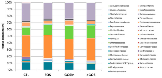 When considering bacterial families occurring at more than 0.01% of the total sample abundances (Table 3), the OS impact was typified by significant decreases in Lactobacillaceae, Bacteroidales S24-7 group, Prevotellaceae, Streptococcaceae, Peptococcaceae, Coriobacteriaceae, Aerococcaceae, Family XIII, and Rikenellaceae. In addition, OS supplementation decreased Ruminococcaceae abundance but this impact only reached statistical significance for FOS and αGOS. These decreases in relative abundance were differently compensated according to the OS: increases in Bifidobacteriaceae reached statistical significance following FOS and αGOS supplementations, Enterobacteriaceae increased following αGOS supplementation and Lachnospiraceae increased following GOS/In supplementation.