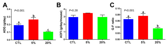 Influences of Scenedesmus feeding on growth performance. The body weight gain and feed intake of three groups of mice, control (CTL), 5% Scenedesmus, and 20% Scenedesmus, were monitored during a 28-day feeding period. (A) Average daily gain (ADG). (B) Average daily food intake (ADFI). (C) Gain to feed ratio (G:F). P-values indicate overall significances across all sample groups from the one-way ANOVA test. Means with different letter labels (a,b,c) indicate significant differences (P < 0.05) between two dietary treatments by the Tukey post hoc test.