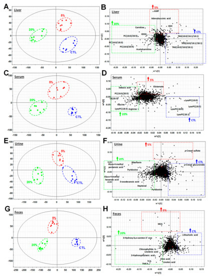 Effects of Scenedesmus diets on hepatic, serum, urinary, fecal metabolomes. Data from LC-MS analysis of liver extract, serum, urine and fecal extract were processed by supervised partial least squares-discriminant analysis (PLS-DA) modeling. The associations of metabolites representing each of the three groups of mice (n = 8/group) are shown in the scores plots. Selective metabolite markers correlating with the experimental diets are labeled in the loadings plots. (A) Scores plot of a PLS-DA model on liver extracts. (B) Loadings plot of a PLS-DA model on liver extracts. (C) Scores plot of a PLS-DA model on serum samples. (D) Loadings plot of a PLS-DA model on serum samples. (E) Scores plot of a PLS-DA model on urine samples. (F) Loadings plot of a PLS-DA model on urine samples. (G) Scores plot of a PLS-DA model on fecal samples. (H) Loadings plot of a PLS-DA model on fecal samples. The symbol “↑” in the loadings plot indicates positive correlation with individual treatment.