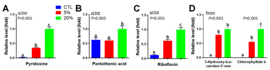Vitamins and pigments as Scenedesmus exposure markers in urine and feces. (A) Pantothenic acid in urine. (B) Pyridoxine in urine. (C) Riboflavin in urine. (D) 3-Hydroxy-b,e-caroten-3′-one and chlorophyllide b in feces. P-values indicate overall significances across all sample groups from the one-way ANOVA test. Means with different letter labels (a,b,c) indicate significant differences (P < 0.05) between two dietary treatments by the Tukey post hoc test.