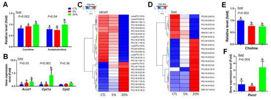 Identification of lipid metabolism-associated changes in serum and liver after Scenedesmus feeding. (A) Hepatic carnitine-related metabolites. (B) Hepatic gene expression levels of PPARα-targeted genes. The control is artificially set as 1. (C) Hierarchal cluster analysis (HCA)-based heat map on the clustering of Scenedesmus-responsive phospholipids (PL) in serum based on their relative abundances. (D) HCA-based heat map on the clustering of Scenedesmus-responsive PL in the liver based on their relative abundances. (E) Choline in the liver. F. Expression level of Pemt gene in the liver. P-values indicate overall significances across all sample groups from the one-way ANOVA test. Means with different letter labels (a,b) indicate significant differences (P < 0.05) between two dietary treatments by the Tukey post hoc test.