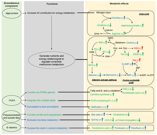 Summary on Scenedesmus-induced metabolic effects and its potential role in modulating metabolic system. Variety of components in Scenedesmus exert different functions in the body, which contribute to the metabolic changes after Scenedesmus feeding. Overall, Scenedesmus feeding targets multiple metabolic system, including urea cycle, purine metabolism, methionine metabolism, nuclear receptor PPARα metabolic pathway, redox balance, and microbial metabolism. Metabolic effects only induced by 5% are presented in red color, whereas 20% are in green color. Blue color indicate the metabolic effects induced by both 5% and 20% feeding. (AA, amino acid; Met, methionine; Hcy, homocysteine; Cys, cysteine; Tau, taurine; SAM, s-adenosylmethionine; SAH, s-adenosylhomocysteine; DMG, dimethylglycine; Asp, aspartic acid; ADP, adenosine diphosphate; ATP, adenosine triphosphate).