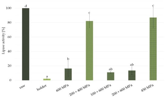 Analyzing the results, it can be observed that the differences in FFA fat content are especially significant in milk pasteurized by HoP, while after high pressure processing, the decrease in FFA content is minor. So when the enzyme was completely destroyed by heat treatment in the HoP samples, the FFA content was the lowest. This rule does not apply to high pressure samples. Among HPP variants, the largest reduction in FFA content was noticed in milk subjected to 100 + 600 MPa pressure, and lipase activity in this variant is significantly diminished. In contrast to this finding, at 200 + 600 MPa, the FFA content is almost intact while enzyme activity is severely lowered (Figure 1, Figure 2). In fact, our results of FFA and lipase activity in human milk after processing are ambiguous. The reason for this discrepancy could be a very low level of FFA in untreated human milk taken as 100%—as a result, any changes given as a percentage lead to large proportional differences [].