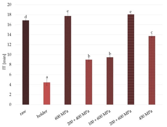 Oxidative stability of raw milk, in the samples after HPP and holder pasteurization. Results are shown as a % value of raw milk with error bars representing SD. Different letters indicate that the samples are significantly different at p < 0.05. IT, induction time.