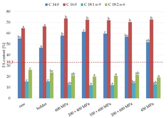 The results regarding the percentage of fatty acids esterified at sn-2 position of TAG from fats are presented in Figure 5 and Table 2. Palmitic acid was located at sn-2 position in 64.7% TAG from raw milk fats, 66.5% fats from milk after HoP. High pressure processing causes a slight increase in the palmitic acid in sn-2 position of TAGs—to about 70% (73.6% in 600 MPa, 72.6% in 200 + 400 MPa, 70.4% 200 + 600 MPa, and 72.8% for 450 MPa). The difference was not statistically significant. Oleic acid at sn-2 was detected in 15% of TAG extracted from raw and holder pasteurized milk samples. After HPP, the percentage of oleic acid at sn-2 position of TAG diminished to 12% for 600 MPa, as well as 200 + 400 MPa and 100 + 600 MPa. In the case of 200 + 600 MPa 10 min, interval 10 min, 10 min, the percentage of the fatty acids esterified at sn-2 position of TAG was 14.1%, and almost the same for 450 MPa, 15 min. (13%).