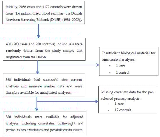 Model selection was performed prior to statistical analyses based on our previous work using these data: (i) univariate models; and (ii) primary adjusted models using possible confounders (covariates associated with neonatal WB-Zinc content (birth weight and birth year), see Kyvsgaard et al. [19]). Due to the construction of our study sample, we also included case status in the multivariate models.