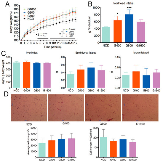 Effect of intake of different doses of GML on the (A) body weight, which expressed as a percentage compared to the initial body weight defined as 100%, (B) total food intake and (C) the liver indices, epididymal fat pad and brown fat pad of mice. (D) H&E staining of the epididymal adipose tissue (n = 6, magnification: 100×). Data were means ± SD; * p < 0.05, *** p < 0.001 compared with the NCD group.