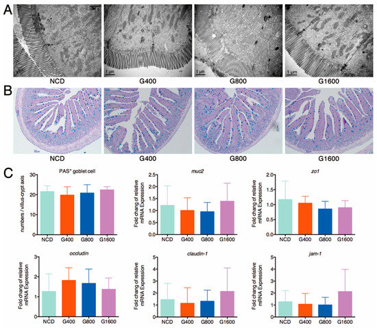 A detailed histological examination of the duodenal and colonic tissue revealed that the global features were unchanged, including the intact epithelial layer and the cell membrane, normal mucosal thickness and well-organized villi and crypt (Supplemental Figure S1). An ultrastructural analysis of the jejunum specimens showed that the rows of epithelial cells were organized closely with narrow paracellular spaces; the microvilli on the cell surface were well-arranged, and the marginal zone of tight junction was clear and complete in the GML-treated mice, similar to the morphological characteristics of the jejunum in the NCD group (Figure 2A). It is important to highlight that GML treatment did not affect the total mucins secretion, as the numbers of PAS-positive goblet cells in the jejunum of GML-treated mice were comparable to the NCD group (Figure 2B,C). Goblet cells generate mucins, mainly Muc2, which constitute the first line of the intestinal barrier [26]. Similarly, there was no significant difference in the mRNA expression of muc2, zo1, occludin, claudin-1 and jam-1 in the ileal section among the different groups (Figure 2C), indicating that GML maintained the integrity of histological features and barrier function of intestine.