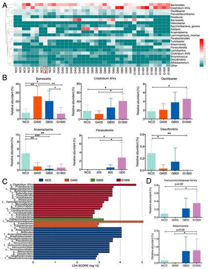 To illustrate the specific changes in the microbial taxa, we further analyzed the relative abundance of the 20 predominant genera in the four groups. The results showed that the 400 and 800 mg kg−1 GML-treated groups showed a significantly higher level of Barnesiella. However, the 1600 mg kg−1 GML-treated group had a similar abundance of Barnesiella as the NCD group (Figure 5A,B). Of note, GML dose-dependently boosted the relative abundant of Clostridium XIVa and Oscillibacter, which reached statistical significance at high dosage (1600 mg kg−1) relative to the NCD group (Figure 5A,B). Within the phylum Proteobacteria, Parasutterella notably thrived (p < 0.05), but Desulfovibrio was not detected in the G1600 group compared with the NCD group. As expected, we found that the level of Anaeroplasma in all the GML-treated groups was considerably lower than the NCD group (Figure 5A,B). The collective results demonstrate that although several particular deviations were observed, GML showed a dose-dependent capacity to modulate the microbial communities, as 400 and 800 mg kg−1 GML regulated some taxa at the family and genus levels, while 1600 mg kg−1 GML operated a more in-depth reconstruction of the microbial community.