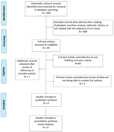 The search strategy returned 958 citations, of which 49 appeared to be relevant. Full texts were subsequently retrieved for detailed assessment. Forty studies were excluded as they did not meet the inclusion criteria of the systematic review. One additional study was identified in the bibliography search of the eligible studies. Among the 10 eligible articles, there were 6 potentially appropriate articles with insufficient data, for which we tried to contact the authors. In the case of two citations, we successfully contacted the senior author, who provided the number of true positive, false positive, true negative, and false negative values. Finally, four potentially appropriate studies were excluded since important information for the systematic review was lacking in two of them and the authors could not be contacted, while two others were excluded because the diagnosis of CD was not clearly described and generated important doubts for the two reviewers. Thus, a total of six eligible studies, including 519 patients and 440 controls, were selected for the analysis (Figure 1) [14,15,24,25,26,27].