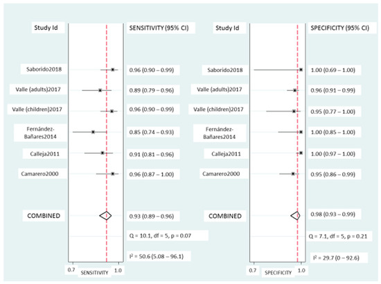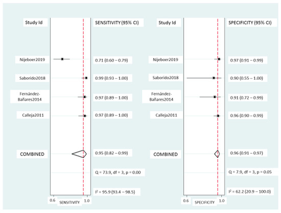 TCRγδ+ IEL: Pooled sensitivity (Figure 5) was 95% (95% CI, 82–99%) with significant heterogeneity (I2 = 95.6%; p < 0.001). Pooled specificity (Figure 5) was 95% (95% CI, 91–97%), with heterogeneity (I2 = 62%; p = 0.05). The SROC curve is described in Figure 3B, being the AUROC of 0.97 (95%, 0.95–0.98), which implies a high diagnostic accuracy for diagnosing CD.