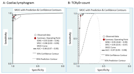 Summary ROC curve (SROC) with confidence and prediction regions around mean operating sensitivity and specificity point of: (A) coeliac lymphogram (increase in TCRγδ+ IEL plus decrease in CD3– IEL); (B) TCRγδ+ count.