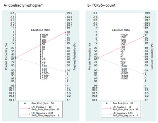 Fagan’s nomogram and the likelihood matrix were used to evaluate the clinical utility of both TCRγδ+ IEL and coeliac lymphogram [23].