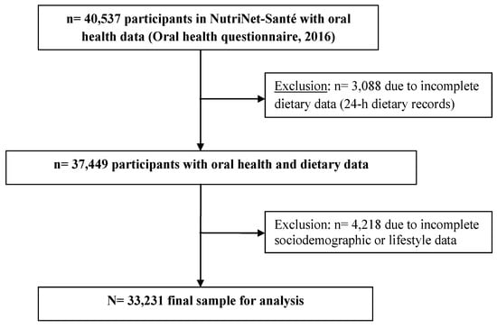 Given the interdependent and complex association among diet, nutrition, and oral health [], the cross-sectional design, which prevented inference of causal links, is considered an important limitation of the study. Dietary and oral health data were not collected at exactly the same time point, with the former (exposure) generally preceding the latter (outcome). Next, GOHAI is an indirect measure of oral health and is not appropriate for dental disease diagnosis []. Moreover, it is often used in samples with compromised oral health [,,]; thus, comparisons across studies might be challenging. Furthermore, our sample consisted of self-selected and likely health-conscious volunteers enrolled in a nutrition-focused cohort, which might explain their relatively good self-reported oral health status. It should also be noted that the majority of the working French population has access to affordable dental care, even though no organized oral health promotion strategies exist []. Additionally, given the relatively high GOHAI scores, the Internet-based design of NutriNet-Santé, and the fact that older age and retirement have been associated with reduced Internet access [] and with increased risk of dental enamel erosion and oral health problems [], we could speculate that the findings might be somewhat biased owing to the potentially low representation in the sample of retired individuals with compromised dental status. In turn, a limitation of any nutrient profile-derived algorithm, including the FSAm-NPS-DI, is that it entails a certain degree of subjectivity regarding selection of components, choice of cutoff values, and scoring criteria []. In addition, it is calculated on the basis of self-reported dietary data. Nonetheless, the algorithm is based on a previously validated model [,,,], and itself has undergone extensive validation [,]. Next, many volunteers were excluded from the analysis due to data completeness issues. Specifically, the study sample was composed of individuals who were somewhat more likely to be former/never smokers, slightly older, and married/cohabiting compared with their counterparts who were excluded from the analysis. These factors have been associated with oral health and/or diet quality [,] and therefore suggest the presence of potentially reduced variability in both the exposure and outcome measures. Moreover, the possibility of non-participation/selection bias necessitates caution when generalizing the findings. In turn, notable strengths of the study include its very large and heterogeneous sample of men and women recruited from the general population, the use of validated diet quality and oral health measures, and the inclusion of many potential confounders in the analysis.