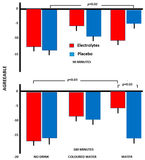 However, after 180 min, those who received a combination of electrolyte and water had the least decline in agreeability, a decline that was significantly lower than for those who received electrolyte plus no drink (p < 0.03) or water plus placebo (p < 0.02). Thus, while electrolyte alone or water alone had no positive impact on ratings of agreeability, a combination of electrolyte plus water proved beneficial, although the same effect was not observed with coloured water and electrolyte.