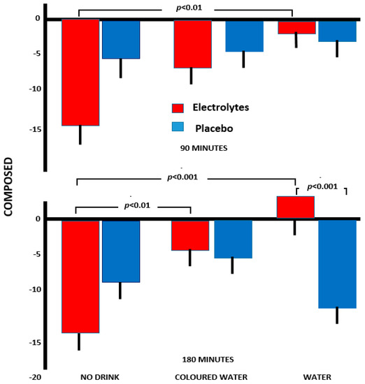 Again, the combination of electrolyte and water most effectively prevented an increase in anxiety. By 180 min, those who received electrolyte plus water reported an overall increase in ratings of composure, something not observed with coloured water.