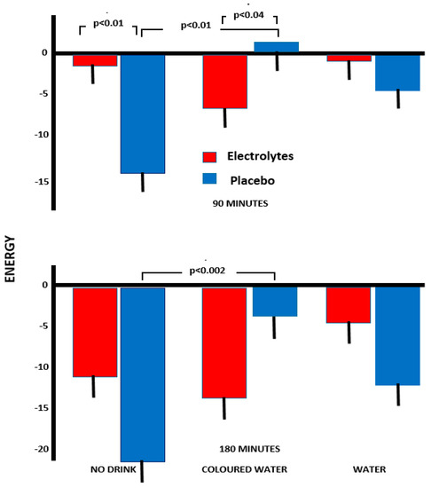 At 90 min, having received coloured water but no electrolyte was associated with the highest ratings of subjective energy; levels were significantly higher than with coloured water and electrolyte (p < 0.04) and those who received no water with no electrolyte (p < 0.01, Figure 3).
