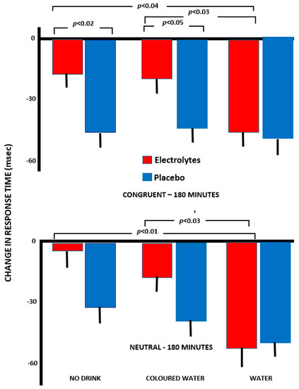 At 90 min, those who received electrolyte plus water had significantly faster response times than those who received electrolyte alone (p = 0.003) or electrolyte plus coloured water (p < 0.02). Similarly, at 180 min (Figure 4), those who received electrolyte plus water were faster than those who received only electrolyte (p < 0.01) or electrolyte plus coloured water (p < 0.03) (Figure 4).