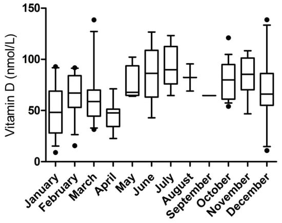 Next to this, low vitamin D concentrations were present in our sample (Figure 1). This was the case for all patient groups, and especially for both groups of PKU patients (8%, 29%, and 24% respectively). Since vitamin D levels are known to differ depending on time of the year [17], Figure 2 shows the vitamin D concentrations observed per month.