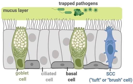 The T1R sweet and T2R bitter taste receptors are expressed in the upper airway in specialized cells called solitary chemosensory cells (SCCs) [,,,,,,,,,,,], sometimes called tuft cells or brush cells due to an apical microvilli tuft sometimes, but not always, observed [,]. SCCs are chemosensory cells with an elongated morphology that are distributed throughout the sinonasal epithelium at a frequency of approximately 1%. The SCC function and signaling appears somewhat similar to the better characterized intestinal tuft cells, named for their apical tuft of microvilli [,,]. The intestinal tuft cells regulate type 2 immunity to parasites [,,]. The tuft cells express chemosensory receptors like T1R3 and succinate receptor SUCNR1 (GPR91) that signal through alpha-gustducin [,,], the G-alpha subunit used by type 2 taste cells []. However, much about airway SCC biology, including their signaling and significance to respiratory diseases, still remains to be determined.