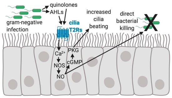 The regulation of human sinonasal epithelial innate immunity by bitter taste receptors (T2Rs). Quinolones and Acyl-homoserine lactones (AHLs) made by gram-negative bacteria, including Pseudomonas aeruginosa, activate the T2Rs expressed in human sinonasal cilia, resulting in an elevation of intracellular calcium (Ca2+) that stimulates nitric oxide (NO) production by activating nitric oxide synthase (NOS) []. NO activates guanylyl cyclase to convert GTP to cyclic-GMP (cGMP), which binds to and increases the activity of protein kinase G (PKG). PKG can phosphorylate ciliary proteins [,] causing increased ciliary beat frequency that speeds up mucociliary transport [,]. NO diffusion into the airway mucus and surface liquid is bactericidal and possibly damaging to viral or fungal pathogens [].