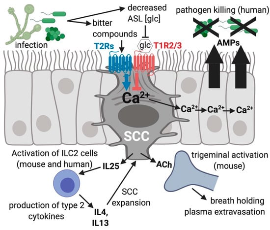 Solitary chemosensory cells (SCCs) function in innate immunity of the airway. Bitter compounds produced during infection can bind to and function as agonists of T2R bitter receptors in SCCs, resulting in a calcium (Ca2+) response that travels via gap junctions to connecting ciliated and goblet cells via gap junctions []. The calcium propagation causes nearby cells to quickly (≤5 min) secrete stored antimicrobial proteins and peptides (AMPs). One type of AMPs are β-defensins, which directly kill fungi as well as gram-negative and gram-positive bacterial pathogens. During times of more sustained exposure to pathogens, SCCs produce cytokines and chemokines that activate inflammatory pathways which likely recruit specific types of immune cells. Stimulated SCCs can activate trigeminal afferent nerves through acetylcholine (ACh) causing plasma extravasation [] and reflexive breath holding []. Airway surface liquid (ASL) glucose (glc) binds SCC T1R2/3 and reduces the activation of the T2Rs within the same SCC, leading to a decrease in AMP release [,]. The different isoforms of T2Rs in SCCs (isoforms 10, 46, 47) and cilia (isoforms 4, 14, 16, 38) respond to different subsets of compounds, potentially allowing the activation of the two different responses at distinct times, which likely depends on which specific infecting organisms and bitter metabolites are present in the airway.