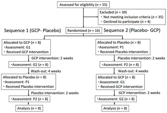 Participants were randomly allocated into two groups; namely, Sequence 1, a group that took GCP tablets first and placebo tablets second (GCP-Placebo); and Sequence 2, a group that took tablets in the reverse order (Placebo–GCP) (Figure 1). In this study, participants and researchers were double blinded. Before registration of the participants, a researcher (Y.M.) who was not informed of the research protocol created randomized codes (1:1 ratio, four-block size) by using Microsoft Excel 2013 (Microsoft) to avoid allocation bias. Two researchers (K.H., T.M.) registered participants, and an assignor (T.Y.) who was not involved in measurements assigned each participant to Sequence 1 or 2. Then, the first blinded test sample was provided by the assignor to the participants.