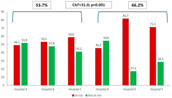 Significant differences were found for at risk of malnutrition between the six hospitals (Chi2 = 164.6, p < 0.001). When the three hospitals from South Africa (Hospitals A–C) were compared to the three hospitals from outside of South Africa (Hospitals D–F), the proportion of at-risk patients in the former (53.7%) were significantly less than the proportion of at-risk patients in the hospital outside of South Africa (66.2%) (Chi2 = 31.0, p < 0.001). (Figure 1.)