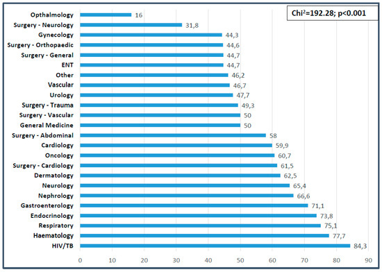 Significant differences were also found between the NRS score obtained and diagnostic category (more patients at risk of malnutrition in medical versus surgical or oncology patients, p < 0.001). Significant differences were noted between the proportion of patients at risk of malnutrition and the primary diagnosis (Chi2 = 192.28, p < 0.001). The highest prevalence of malnutrition risk was found in patients with HIV/TB (84.3%), hematology (77.7%), respiratory (75.1%), endocrinology (73.8%), and gastroenterology (71.1%) conditions (Figure 2).