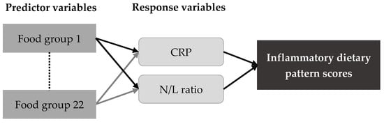 We used SAS 9.4 (SAS Institute Inc., Cary, NC, USA) and STATA version 13 (StataCorp LP, College Station, TX, USA) for statistical analysis. Continuous and categorical variables were presented as mean ± standard deviation (SD) and number (percentage), respectively. The continuous or categorical variables in the characteristics of study participants were compared between genders using Mann-Whitney U or chi-square test, respectively. Characteristics of the participants across quartiles of dietary pattern scores were analyzed using Kruskal-Wallis test for continuous variables. A linear regression analysis represented by β and 95% confidence intervals (CIs) and a logistic regression analysis represented by odds ratios (ORs) and 95% CIs were performed, respectively, to examine the association of dietary pattern scores with the biomarkers of interest and the risk of dyslipidemia and anemia. The dietary pattern was identified by reduced rank regression (RRR) model using PROC PLS function in SAS 9.4 from 22 food groups as predictor variables and CRP and N/L ratio as response variables (Figure 1). The RRR model is a multivariable linear function, which combines predictor variables (derived from SQ-FFQ) and response variables (refer to nutrients or blood biomarkers) to identify a dietary pattern that was related to disease of interest [24]. The RRR model has been described more detail and documented elsewhere [25,26]. The food groups with the absolute value of factor loading ≥0.20 were used to correspond to the response variables and then derived the dietary pattern associated with inflammation. For further analysis, dietary pattern scores were divided into quartiles and two adjusted models were used: model 1 adjusted for age and BMI and model 2 adjusted for model 1 variables, smoking, alcohol drinking, physical activity, sleep duration, family income, education, marital status, cardiovascular disease, diabetes, hypertension (for dyslipidemia), and dyslipidemia (for anemia). A p-value <0.05 was considered statistically significant.