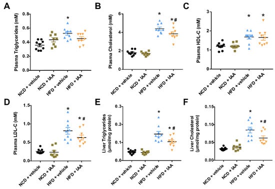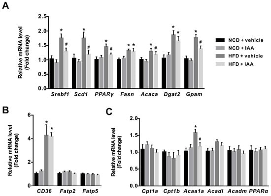 3.2. The Plasma and Hepatic Lipids Content of Mice Exposed to a High-Fat-Diet Feeding and Indole-3-Acetic Acid Treatment