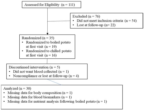 The main outcome was to compare the area under the curve (AUC(0–120 min)) glucose between potato interventions (boiled vs. chilled). Based on previous data [10], a large effect size of 0.8 was calculated based on the significant reduction in AUC glucose observed after RS intake. For a more rigorous study design, a more conservative moderate–high effect size of 0.7 was used to calculate the sample size for this study. A priori analysis using G × Power 3.1.9 determined a sample size of 29 for a paired-t test with a power of 0.95 and alpha of 0.05. The final sample size for this study included 30 subjects. Missing data were treated by pairwise deletion. Descriptive statistics (minimum, maximum, mean, and SD) were calculated for all continuous variables. The AUC(0–120 min) was calculated for each biomarker using the trapezoid formula. Differences between boiled and chilled potatoes at each blood collection time point and the AUC(0–120 min) was determined by a Wilcoxon signed ranks test. For the dietary data, the mean energy and nutrient intake three days prior to each intervention and subsequent 48 h were calculated for each potato intervention. The mean intake between each phase, as well as difference from pre-to-post was compared by Wilcoxon signed ranked test. The relationship among body composition and AUC(0–120 min) biomarkers, subjective satiety within-and-between potato interventions, and subjective satiety with the AUC(0–120 min) for biomarkers known to influence satiety were assessed using Spearman’s rho correlations. SPSS version 25 (Armonk, NY, U.S.A.) was used to perform all analysis. A p < 0.05 indicates a significant difference.