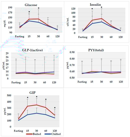Biomarker responses from fasting to 120 min following boiled (red line) and chilled (blue line) potato intake. * p < 0.05 between groups using non-parametric Wilcoxon Signed Ranks Test. GLP-1, glucagon-like peptide-1; PYY, peptide YY; GIP, glucose-dependent insulinotropic-peptide.