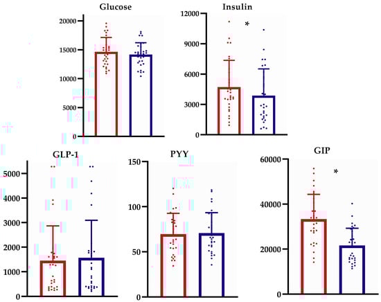 Comparison of the area under the curve (AUC0–120 min) biomarker response between boiled and chilled potato intake. * p < 0.05 between groups using non-parametric Wilcoxon Signed Ranks Test. Red color refers to the AUC(0–120 min) for the boiled potato; blue color refers to the AUC(0–120 min) for the chilled potato. GLP-1, glucagon-like peptide-1; PYY, peptide YY; GIP, glucose-dependent insulinotropic-peptide.