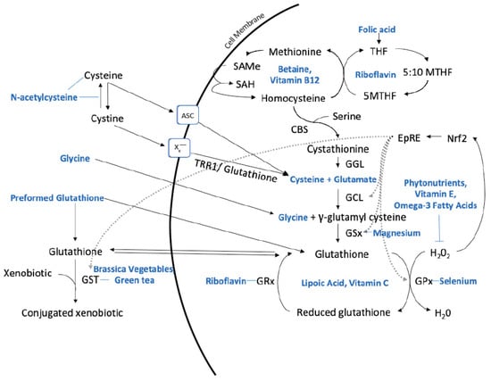 Hepatic synthesis of glutathione and nutritional substrates, co-factors, and other nutrients that influence metabolism. Key: 5-Methyl-tetrahydrofolate (5MTHF), system alanine–serine–cysteine (ASC), cystathionine-β-synthase (CBS), cystathionine gamma-lyase (CGL), electrophile response element (EpRE), glutathione-S-transferase (GST), glutamate cysteine ligase (GCL), glutathione reductase (GRx), glutathione peroxidase (GPx), glutathione synthetase (GSx), hydrogen peroxide (H2O2), Nuclear factor erythroid factor-2-related factor 2 (Nrf2), S-adenosylmethionine (SAMe), S-adenosylhomocysteine (SAH), tetrahydrofolate (THF), thioredoxin reductase 1 (TRR1), water (H2O), cystine/glutamate antiporter system (xc−). Description: Folic acid is reduced to THF and converted to 5MTHF which can subsequently be transferred to homocysteine and generate methionine. Methionine forms SAMe, which produces SAH from methylation reactions. SAH is hydrolyzed to homocysteine. Homocysteine can either regenerate methionine or be directed to the trans-sulfuration pathway forming cystathionine via the catalytic activity of CBS and serine. CGL cleaves the sulfur–gamma carbon bond of cystathionine, resulting in the release of cysteine which can be used by GCL and GSx to form glutathione. Extracellular cysteine can be either taken up by the cysteine transporter ASC or oxidized to cystine and taken up by system xc−. N-acetylcysteine can donate cysteine or reduce plasma cystine to cysteine. Intracellular cystine is reduced to cysteine via TRR1 or glutathione. The synthesis of γ-glutamyl cysteine is catalyzed by GCL from cysteine and glutamate, and the addition of glycine to γ-glutamyl cysteine via GSx generates glutathione. GPx catalyzes the reduction of H2O2 by glutathione and forms reduced glutathione which is then recycled to glutathione by GRx. Glutathione can also form adducts and conjugate xenobiotics via GST. Oxidative stress activates the Nrf2 pathway which induces EpRE-dependent gene expression of enzymes involved in glutathione metabolism, including GCL, GSx, GPx, and GST, to re-establish cellular redox homeostasis. Modified and developed from [10,11,12,13,14].