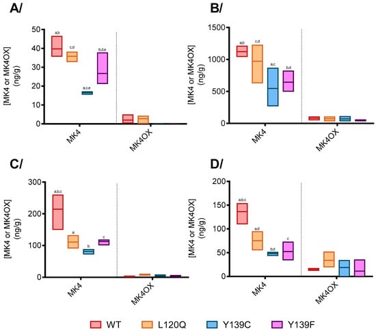 Vitamins K concentrations in (A)/liver, (B)/testis, (C)/kidney, and (D)/lung of rats homozygous for WT-, L120Q-, Y139C-, or Y139F-Vkorc1 fed with a standard rodent diet. The box extends from the 25th to 75th percentiles and the line corresponds to the mean. Statistical analyses were performed using a Tukey’s multiple comparisons test. p < 0.05 was the accepted level of significance. a,b,c,d,e, statistical difference between 2 groups.