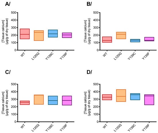 Calcium concentration was measured in testis, kidneys, lungs, and hearts of rats homozygous for wild type, Y139C, Y139F, or L120Q fed with a standard rodent diet. Results are presented in Figure 3. No difference was observed between strains.